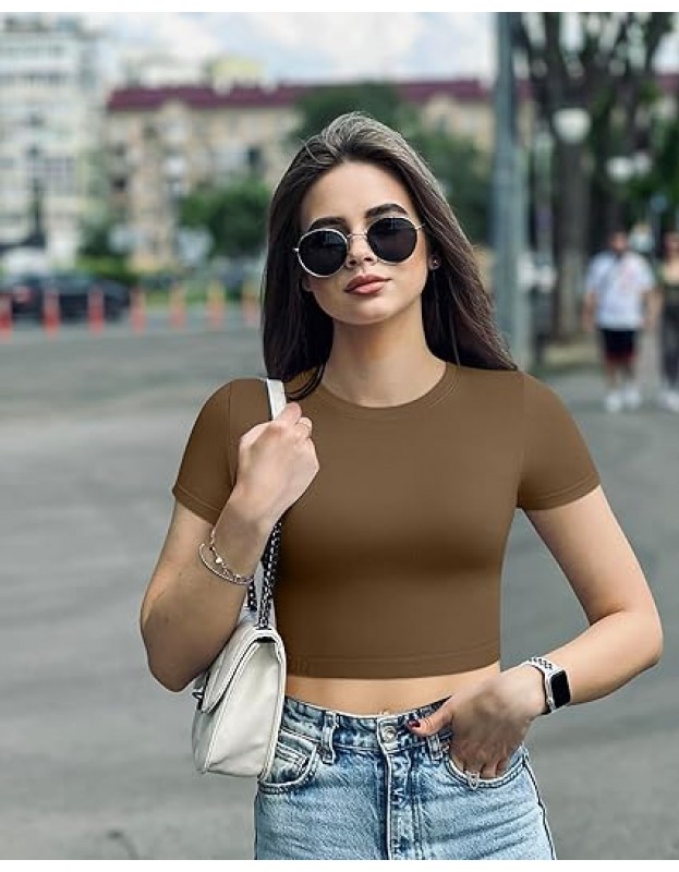 Women's 3 Piece Crop Tops Crew Neck Shorts Sleeve Stretch Fitted Shirts Crop Tops