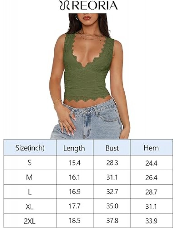 REORIA Womens Sexy V-Neck Sleeveless Double Lined Going Out Y2K Trendy Lace Cropped Tank Tops